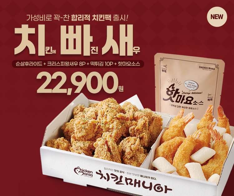통통한 크리스피왕새우와 바삭한 순살후라이드의 황금조합을 한 팩에! 쫄깃 떡튀김에 매콤 핫마요소스까지 담긴 가성비 끝판왕! (콜라, 치킨무 미제공)