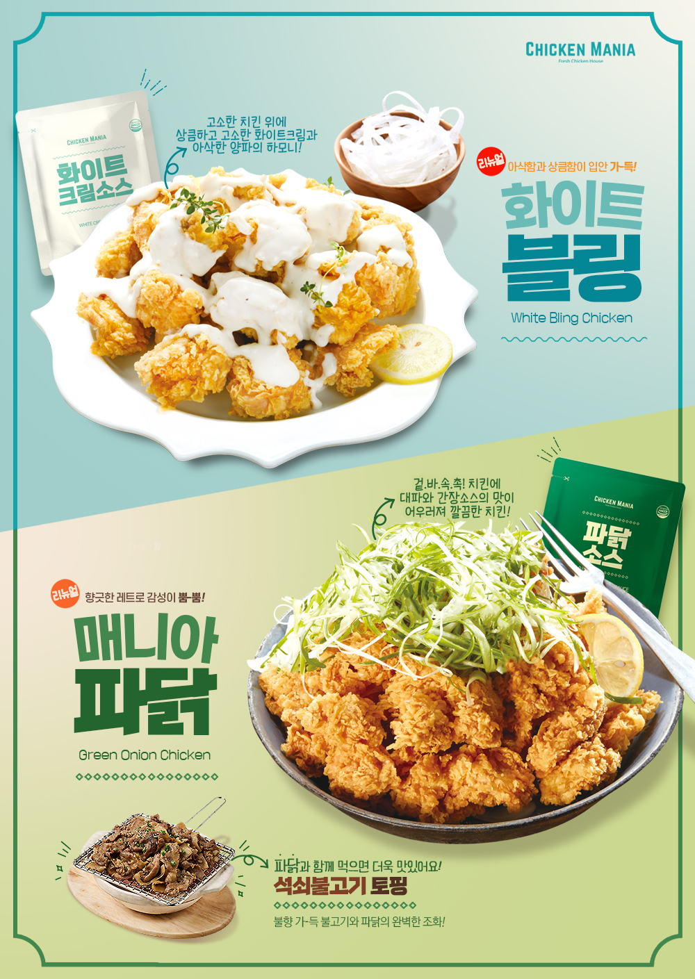 치킨매니아가 “화이트블링”과 “매니아파닭”을 리뉴얼하여 재출시하였습니다.