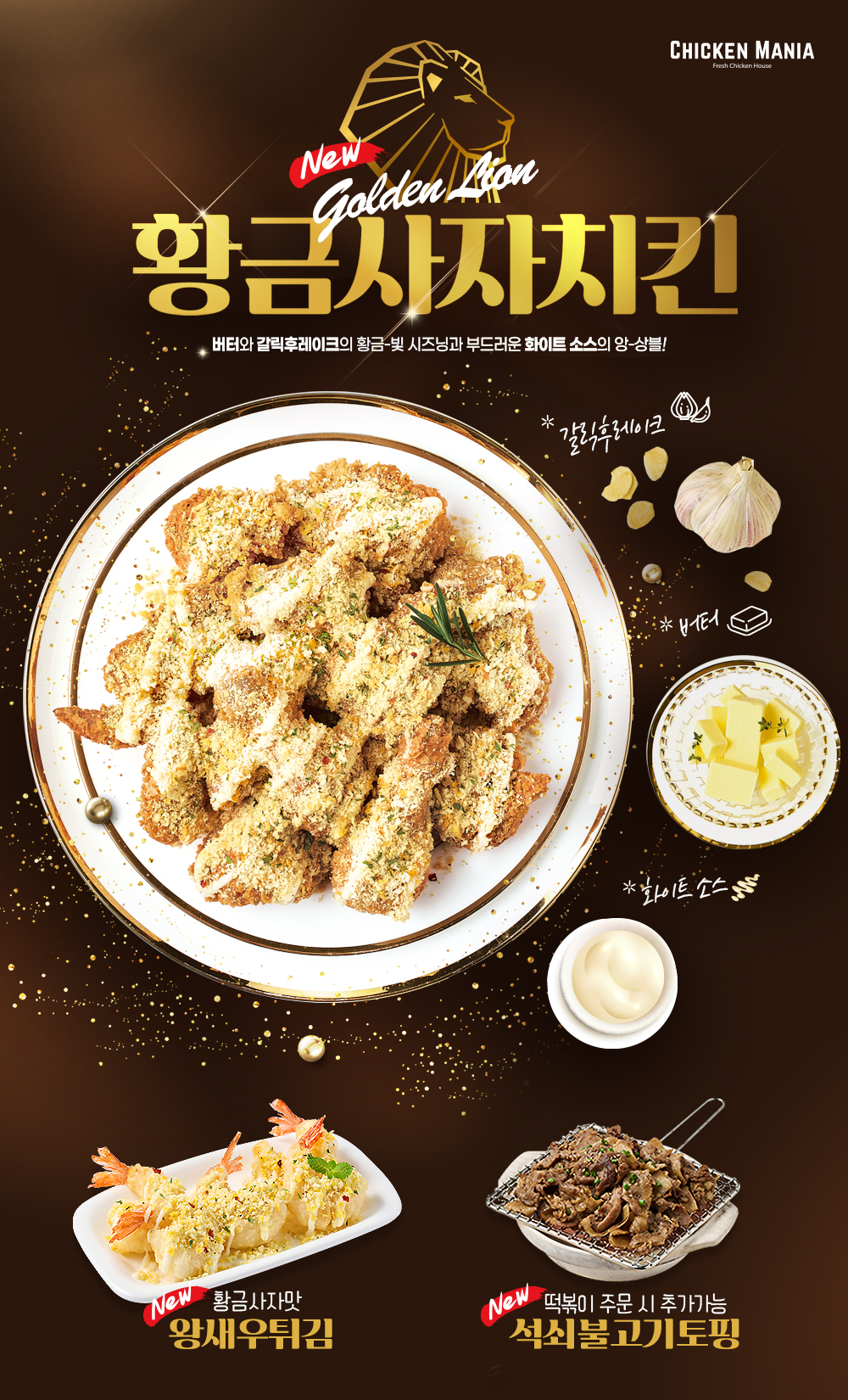 치킨매니아가 신메뉴 “황금사자치킨”와 “왕새우튀김(황금사자맛)” 그리고 떡볶이용 토핑인 “석쇠불고기토핑”를 출시하였습니다.