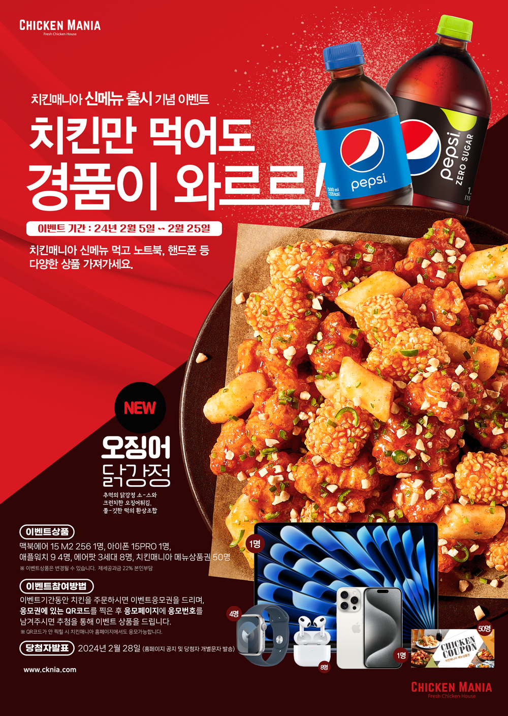 ◾이벤트 기간 : 2024년 2월 5일(월)~ 2월 25일(일) ◾이벤트 참여방법 : 이벤트기간동안 치킨을 주문하시면 이벤트응모권을 드리며, 응모권에 있는 QR코드를 찍은 후 응모페이지에 응모번호를 남겨주시면 추첨을 통해 이벤트 상품을 드립니다. (홈페이지 첫 화면 이벤트 팝업창 참여하기 or 아래 참여하기 클릭하시면 이벤트 페이지로 이동합니다.) ◾이벤트 상품 : 맥북에어 15 M2 256 1명, 아이폰 15PRO 1명, 애플워치 9 4명, 에어팟 3세대 8명, 치킨매니아 메뉴상품권 50명 ◾당첨자 발표 : 2024년 2월 28일(수) 당첨자 개별문자 발송 ◾이벤트 문의전화 : 070-7717-8422 <이벤트가 종료되었습니다. 감사합니다.> ⚠이벤트 참여 유의사항⚠ - 이벤트 참여페이지 하단<제출>까지 누르셔야 정상적으로 이벤트 참여가 완료됩니다. - 상기 이벤트 상품은 당사 사정에 의해 변경될 수 있으며, 가스연료는 포함되지 않습니다. - 이벤트 당첨자는 무작위로 추첨하여 선정하며, 이에 대한 이의신청은 받지 않습니다. - 이벤트에 참여해주시는 분들은 개인정보 사용에 동의함으로 간주되며 개인정보는 이벤트 외 다른용도로 사용되지 않습니다. - 이벤트에 부정한 방법(타인 명의 도용 등)으로 응모 시 당첨은 자동 취소됩니다. - 이벤트와 관련하여 당첨자 연락 미응답 및 장기 부재 시 당첨은 자동 취소됩니다. - 당첨자가 해외 거주자의 경우 당첨은 취소될 수 있습니다. - 이벤트 당첨 후 상품의 타인 양도 및 판매를 금지합니다. - 이벤트 당첨자 고객정보는 치킨매니아와 협력사 한국펩시콜라(주)에 제공되며, 별도 당첨 고지 및 개인정보 수집 예정입니다. - 이벤트 기간 내 제출하신 개인정보로 당첨 안내를 하며, 이벤트종료 후 개인정보(성함/연락처/주소)는 변경이 불가합니다. - 상품 당첨 시 제세공과금 22% 당첨자 본인부담이며, 필요서류 수납 및 제세공과금 입금확인 후 상품이 발송됩니다. 제세공과금 미 입금 시 당첨은 자동 취소됩니다. - 소득신고를 위해 당첨자는 신분증사본을 제출하셔야 하며, 수집한 개인정보는 소득신고 후 지체없이 파기합니다.